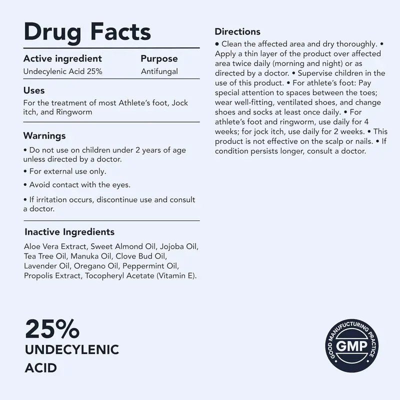 Powered by 25% Undecylenic Acid - the maximum strength allowed without a prescription - our formula is proven clinically effective to treat common fungal skin athlete's foot infections. This antifungal active ingredient helps relieve itching, burning, and irritation at the source, so you can step forward with comfort and confidence.
